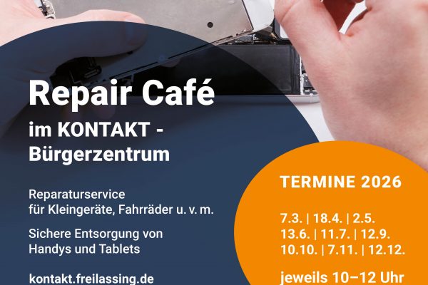 07.03.2026 10:00 Uhr - 12:00 UhrRepair CaféDas Repair Café ist ein Ehrenamtsprojekt in Freilassing. Einmal im…