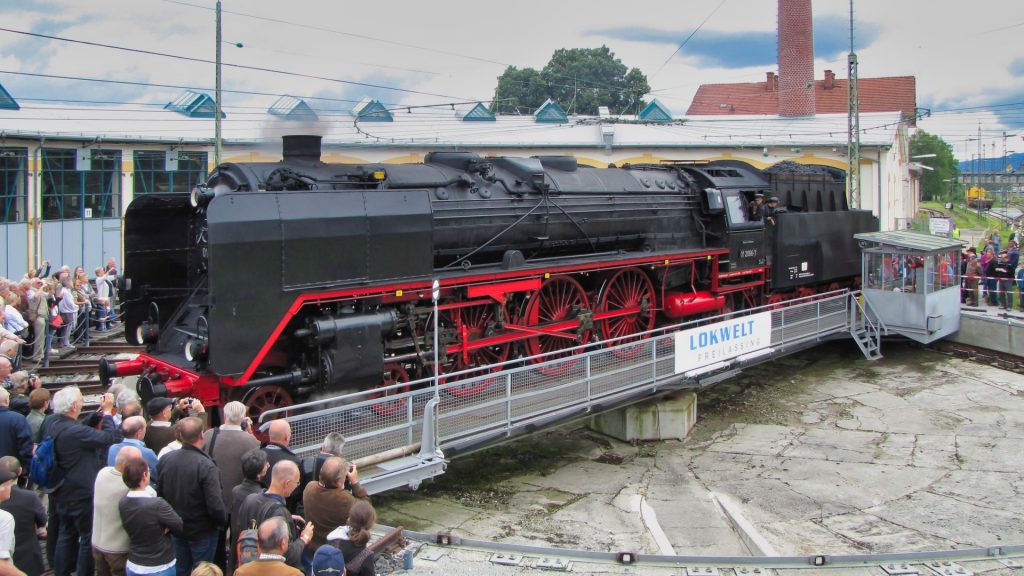 Geplante Ankunft am Freilassinger Bahnhof ist gegen 11.45 Uhr. Dort wird die Lok abgekuppelt und kommt im Anschluss auf die Drehscheibe der Lokwelt gefahren, um ausgedreht zu werden. Die 24 Meter lange Lok, Baujahr 1936, kann so die abendliche Heimfahrt mit dem Kamin in die richtige Richtung antreten.