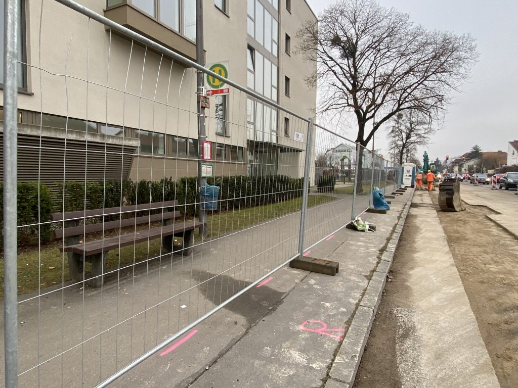 Auf Höhe der Bushaltestelle beim Seniorenheim beziehungsweise nahe bei der Einfahrt in die Mittlere Feldstraße (Hausnummern 25 a – b) wird dort, wo sich auch vor Beginn der Arbeiten eine Verkehrsinsel befand, für über den Winter eine provisorische Querungshilfe für Fußgänger und Radfahrer installiert. Die Kehrmaschine wird die Münchener Straße zwischen Rathaus-Kreisverkehr und Oberer Feldstraße mit Beginn der Baustellen-Winterpause noch reinigen.