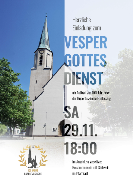 Herzliche Einladung zur feierlichen Vesper als Auftakt zur 100-Jahr-Feier der Rupertuskirche Freilassing.