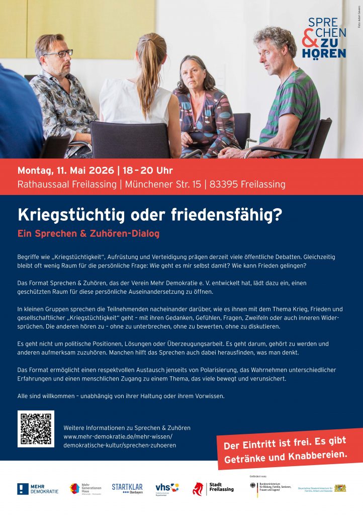 Freilassing, Mai 2026 – Nach dem erfolgreichen Dialogabend am 14. April zum Thema Klima lädt das Mehrgenerationenhaus Freilassing gemeinsam mit dem Verein Mehr Demokratie e. V. erneut zum moderierten, offenen Austausch ein: Am Montag, 11. Mai 2026, von 18 bis 20 Uhr im Rathaussaal Freilassing steht die Frage „Kriegstüchtig oder friedensfähig?“ im Mittelpunkt.