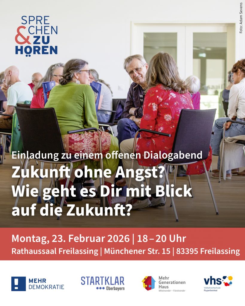 Die Zukunft betrifft uns alle. Manche Dinge machen Mut, andere machen Sorgen. Oft überfordert uns die Unsicherheit. Wie geht es dir damit, hier in Freilassing? Bei dem von Mehr Demokratie e. V. entwickelten Dialogformat Sprechen & Zuhören geht es nicht um Diskussion oder Recht haben. Wir nehmen uns Zeit, einander wirklich zuzuhören. Jede Meinung zählt – auch deine!