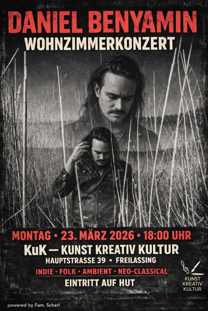 Freilassing. Am Montag, 23. März 2026, um 18 Uhr ist der international tätige Musiker Daniel Benyamin zu Gast im KuK – KUNST KREATIV KULTUR, Hauptstraße 39 in Freilassing. Das Konzert findet im intimen Rahmen eines Wohnzimmerkonzerts statt.