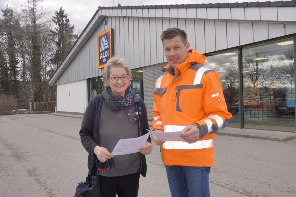 Stadtwerkeleiter Markus Kinzel übergibt Aldi-Filialleiterin Monika Höhr die Anwohnerinfo für die bevorstehenden Arbeiten. Die Stadtwerke stehen während der gesamten Baumaßnahme in enger Abstimmung mit betroffenen Grundstücksanliegern.